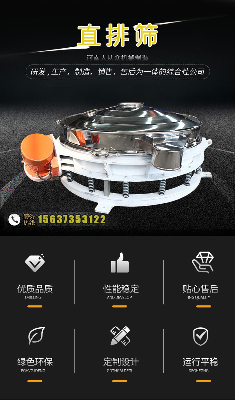 直排篩是以單個或兩個振動電機作為激振源,物料在振動源的作用下以橢圓軌跡運行,可使物料快速通過篩網,進料口和出料口在同一垂直方向,極大提高了篩分效率,最終完成篩分過程。