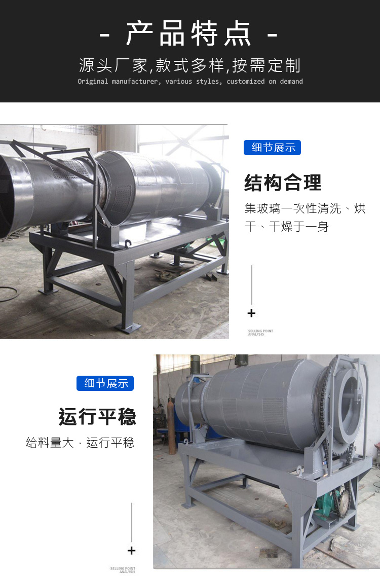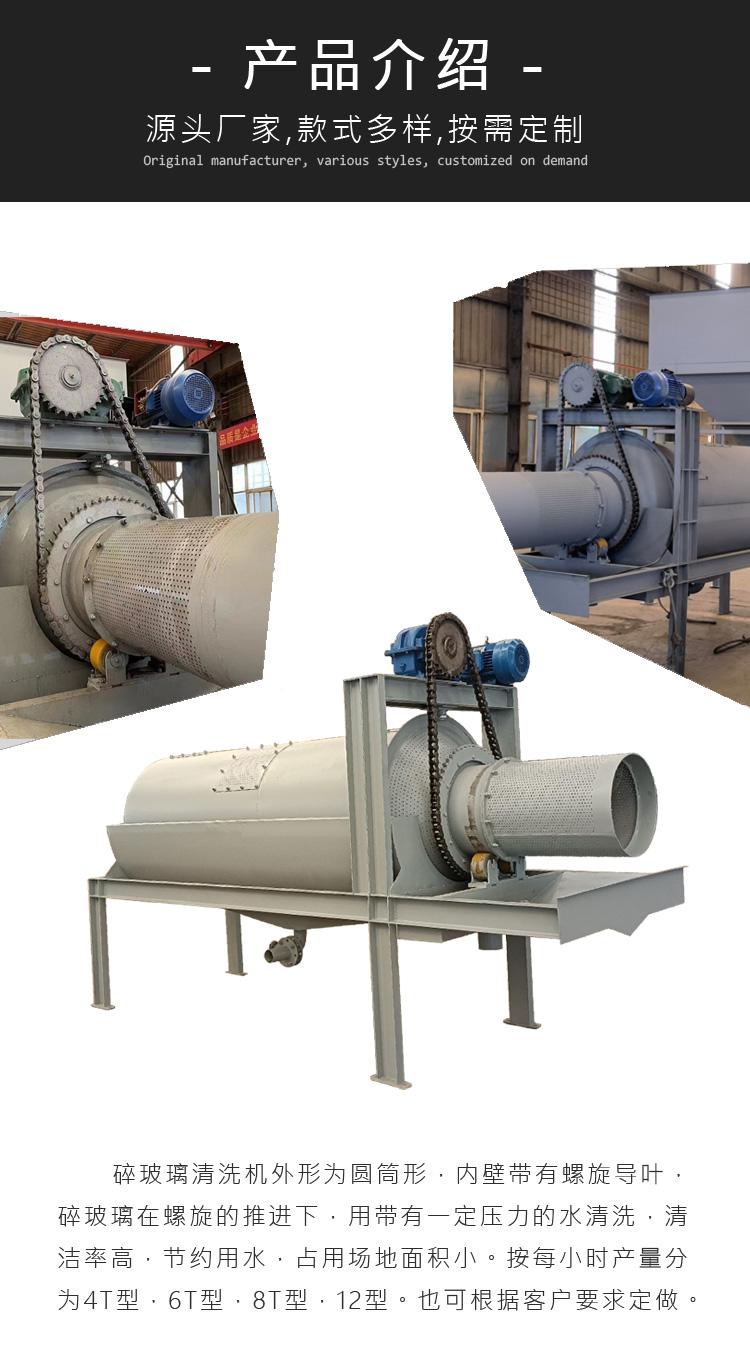 本公司生產的碎玻璃清洗機為圓筒形,可采用水洗,也可干洗,清洗效果都挺好的;按照不同的產量分為多個不同的型號,如4T、6T、8T、12T等型號,也可按需求定制生產。