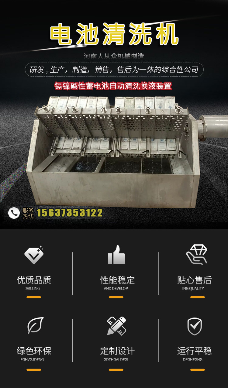 鎘鎳堿性蓄電池清洗換液設(shè)備將蓄電池用機(jī)械夾緊裝置固定在旋轉(zhuǎn)槽上,旋轉(zhuǎn)槽自帶停止制動功能。旋轉(zhuǎn)槽旋轉(zhuǎn)時帶動蓄電池360度旋轉(zhuǎn),液體在蓄電池內(nèi)部隨蓄電池的旋轉(zhuǎn)開始流動,通過控制旋轉(zhuǎn)速度及旋轉(zhuǎn)方向來控制在蓄電池內(nèi)部的流動速度及方向。最后通過控制時間及清洗次數(shù)來達(dá)到最終干凈效果。對蓄電池的極板無任何損傷,排除了人工清洗的安全隱患。