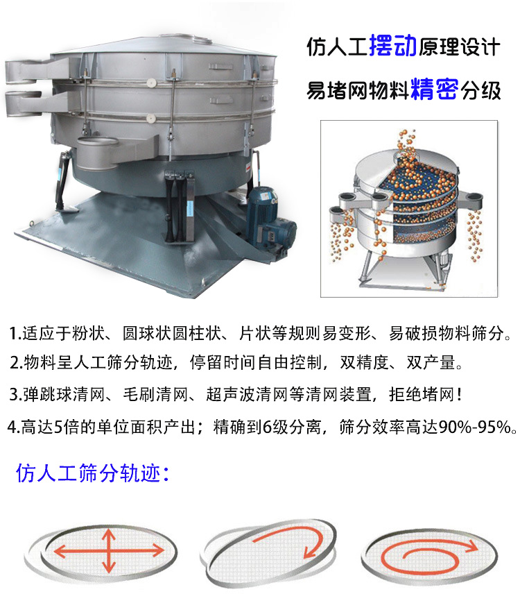 圓形搖擺篩的仿人工設計是針對高產、高精度物料篩分的需求而專門設計的高效篩分機。