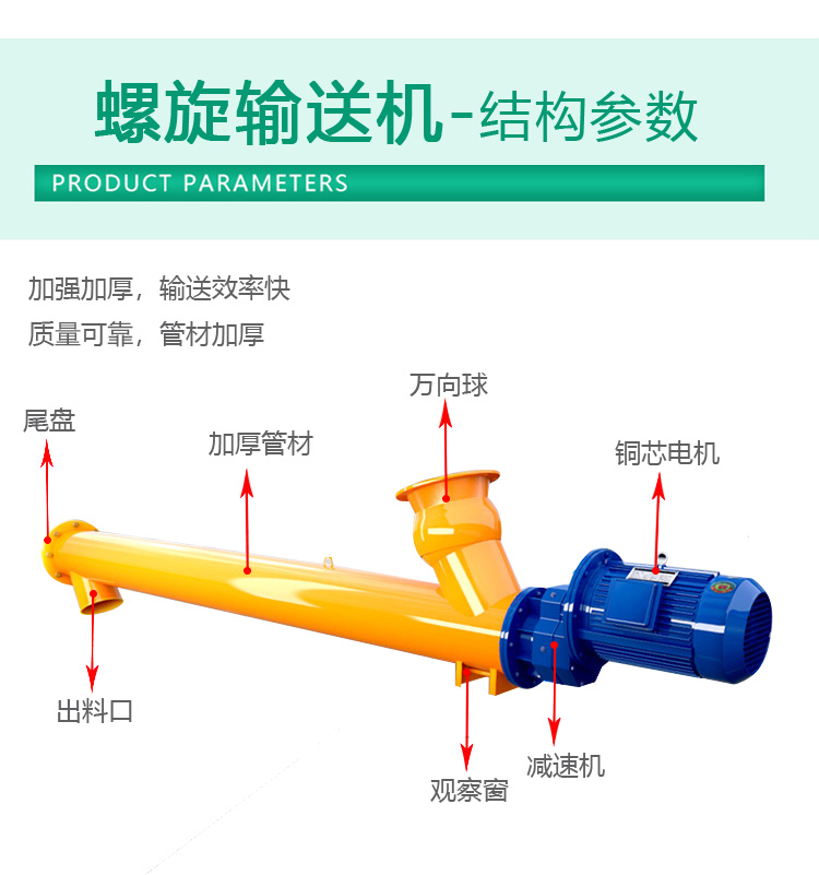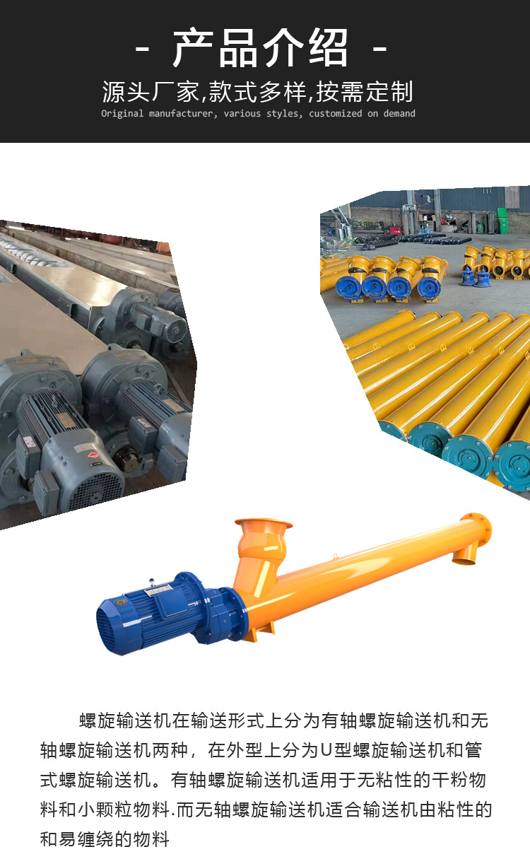螺旋輸送機利用螺桿旋轉(zhuǎn)將物料推送到目的的機器。可分為軸向螺旋輸送機和無軸螺旋輸送機兩種。從外觀上看,可分為U型螺旋輸送機和管狀螺旋輸送機。