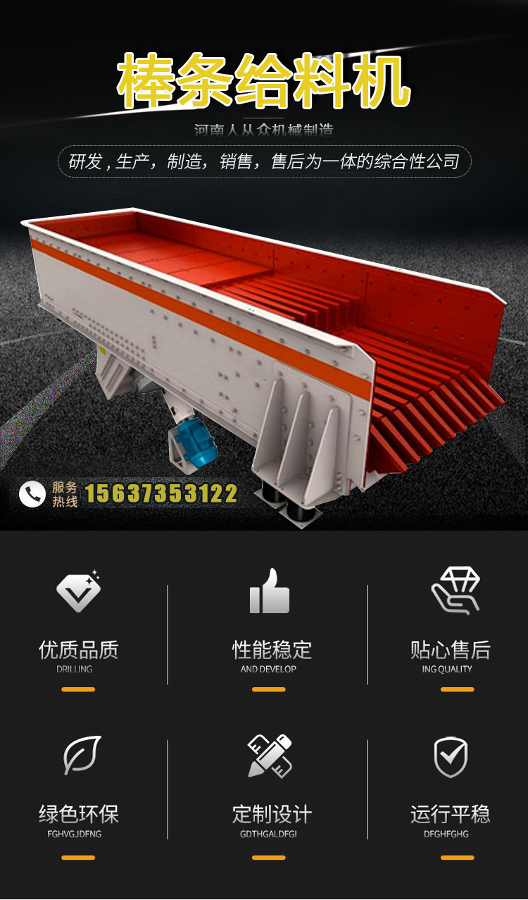 棒條給料機由新型振動電機驅動,它可以去除土壤等細料,實現(xiàn)預篩功能,通常用于破碎機前的均勻給料,提高粗碎能力,結構堅固,強度高,耐沖擊,耐磨,使用維護方便。